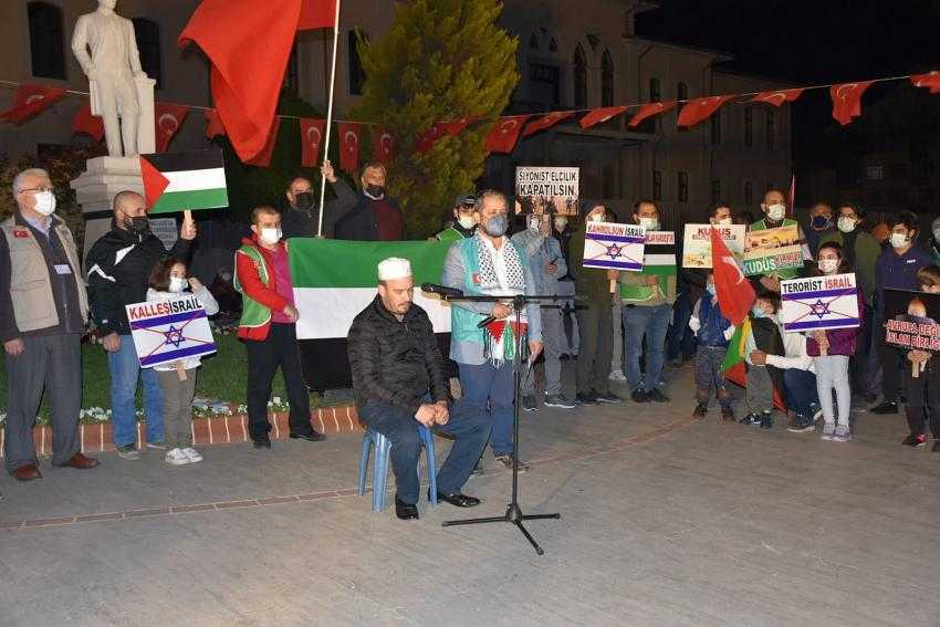 Sivil toplum örgütlerinin destek verdiği protesto mitinginde, “Kudüs’e selam, direnişe devam” sloganları atıldı.