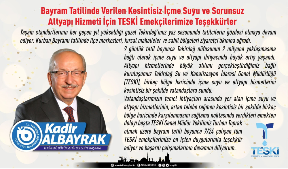 Konu ile ilgili açıklama yapan Tekirdağ Büyükşehir Belediye Başkanı Kadir Albayrak, " Yaşam standartlarının her geçen yıl yükseldiği güzel Tekirdağ'ımız yaz sezonunda tatilcilerin gözdesi olmaya devam ediyor. Kurban Bayramı tatilinde ilçe merkezleri, kırsal mahalleler ve sahil bölgeleri ziyaretçi akınına uğradı. 9 günlük tatil boyunca Tekirdağ nüfusunun 2 milyona yaklaşmasına bağlı olarak içme suyu ve altyapı ihtiyacında büyük artış yaşandı. Altyapı hizmetlerinde büyük atılımı gerçekleştirdiğimiz bağlı kuruluşumuz Tekirdağ Su ve Kanalizasyon İdaresi Genel Müdürlüğü (TESKİ), birkaç bölge haricinde içme suyu ve altyapı hizmetlerini kesintisiz bir şekilde vatandaşlara sundu. Vatandaşlarımızın temel ihtiyaçları arasında yer alan içme suyu ve altyapı hizmetlerinin, artan talebe rağmen kesintisiz bir şekilde birkaç bölge haricinde karşılanmasını sağlama noktasında verdikleri emekten dolayı başta TESKİ Genel Müdür Vekilimiz Turhan Toprak olmak üzere 7/24 çalışan tüm TESKİ emekçilerimize en içten duygularımla teşekkür ediyor ve başarılı çalışmalarının devamını diliyorum." dedi.