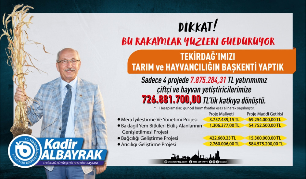 Konu ile ilgili açıklama yapan Tekirdağ Büyükşehir Belediye Başkanı Kadir Albayrak, “Tekirdağ Büyükşehir Belediyesi, Tekirdağ’ın tarım ve hayvancılıkta Türkiye’nin en önde gelen illeri arasında yer almasından hareketle ilk kurulduğu gün ile beraber 5 ana vizyonu arasına tarım ve hayvancılığa yer vererek bu alanda birçok önemli projeyi hayata geçirdi. 2014- 2021 yılları arasında uygulamış olduğumuz Mera İyileştirme ve Yönetim Projesi’nin proje maliyeti 3.757.439,15 TL, proje maddi getirisi 69.254.000,00 TL; Baklagil Yem Bitkileri Ekiliş Alanlarının Genişletilmesi Projesi’nin proje maliyeti 1.306.377,00 TL, proje maddi getirisi 54.752.500,00 TL; Bağcılığı Geliştirme Projesi’nin proje maliyeti 422.660,23 TL, proje maddi getirisi 15.300.000,00 TL; Arıcılığı Geliştirme ve Polinasyon Projesi’nin ise proje maliyeti 2.760.006,00 TL, proje maddi getirisi ise 584.575.200,00 TL’dir. Böylece sadece 4 projede 7.875.284,31 TL yatırımımız çiftçi ve hayvan yetiştiricilerimize 726.881.700,00 TL’lik katkıya dönüştü. Projeler genel olarak ele alındığında “en doğru proje en çok ses getiren projedir” diye bir algı vardır, aslında bu yaygın görüş gerçeği yansıtmamaktadır. Çünkü başarısı ile ses getiren projelerin haricinde maalesef reklamlar ile şişirilen ancak içi boş olan birçok proje vardır. Bu nedenle biz, uygulamakta olduğumuz projeleri sürekli sahada takip ederek gerçek faydalarını tespit ediyoruz. İlimiz, tartışmasız bir şekilde tarım ve hayvancılıkta Türkiye'nin en önde gelen illeri arasında yer alıyor. Bu nedenle Belediyemizin ilk kurulduğu gün ile beraber 5 ana vizyonu arasında tarım ve hayvancılığa yer verdik ve bu doğrultuda birçok proje uyguladık. Uygulamaya da devam ediyoruz. Tarım ve hayvancılık, bu bölgenin en temel geçim kaynağı. İlimiz arazilerimizin yüzde 65'i tarım arazisidir, bu alanda yüz ölçümünün tarımda kullanılma oranı olarak Türkiye’nin en önde gelen İli olma özelliğini taşımaktadır. Tarım ve hayvancılığımızın çok zor günler geçirdiği bu dönemde bu çalışmalar tabi ki tüm ihtiyacı karşılama noktasında yeterli gelmeyeceği için alanında uzman teknik ekiplerimizce kırsal mahallelerimizde yapılan incelemeler doğrultusunda sürekli yeni projeler hazırlanmakta ve uygulanmaktadır. Projelerimizin ilimize ve vatandaşlarımıza hayırlı olmasını dilerim.” dedi.