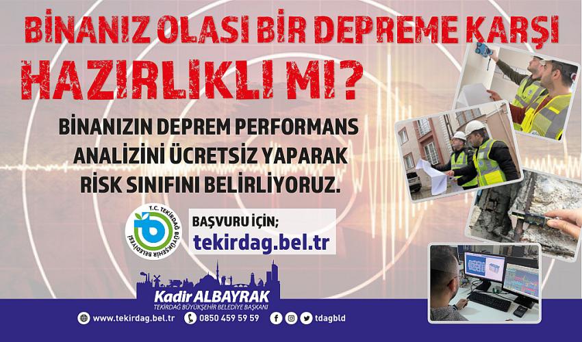 Betonarme binaların deprem performansının belirlenmesine yönelik çalışma, 6306 sayılı Afet Riski Altındaki Alanların Dönüştürülmesi Hakkında Kanun kapsamında yapılan Riskli Yapı Tespiti olmadığını belirten Tekirdağ Büyükşehir Belediye Başkanı Kadir Albayrak konu ile ilgili yaptığı açıklamada, “Büyükşehir Belediyesi olarak depreme hazırlık çalışmalarımızı titizlikle sürdürüyoruz. Binaların deprem performansının belirlenmesine yönelik ücretsiz olarak başlattığımız çalışma kapsamında Belediyemiz bünyesinde teknik bir saha ekibi kurulmuş olup, bina tarama çalışmalarında kullanılmak üzere donatı röntgen cihazı, beton test çekici, dijital kumpas ve diğer test ekipmanları temin edildi. Kurulan saha ekiplerince binaların mimari ve statik projesi üzerinden incelemesi yapılacaktır. Gerekli görülen taşıyıcı sistem elemanlarında beton kalitesi ve donatıların mevcut durumu ile ilgili inceleme yapılacaktır. Olası bir deprem anında halkımızın can ve mal güvenliğini sağlamaya yönelik çalışmalarımız bundan sonra da hız kesmeden devam edecektir.” dedi.