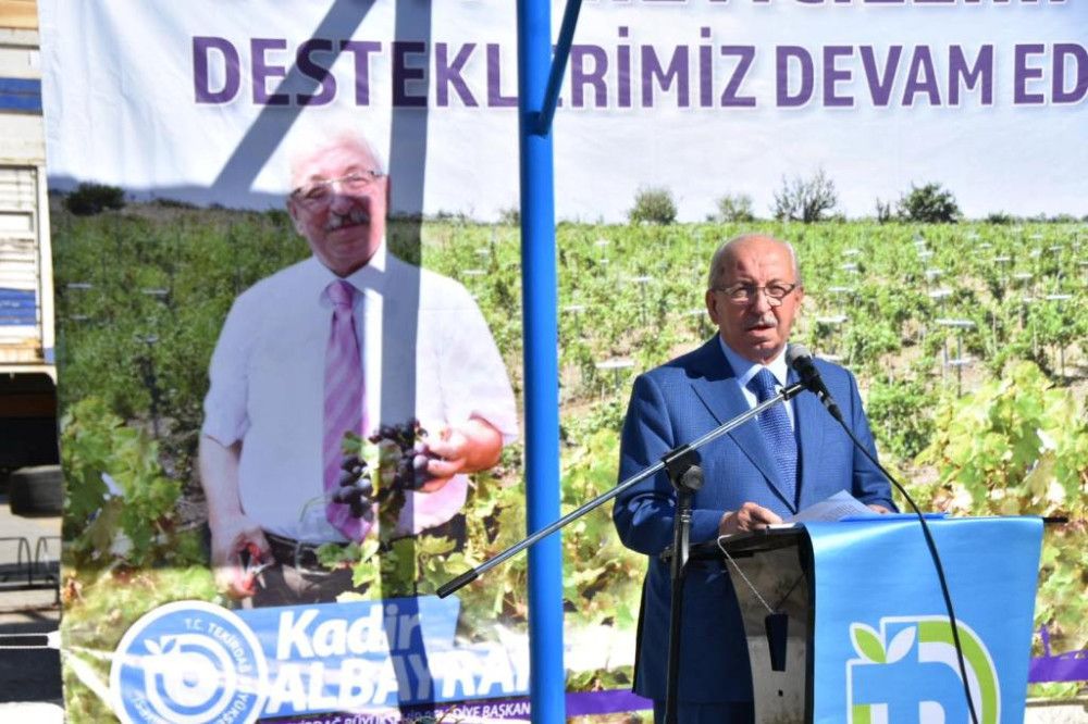Törende bir konuşma yapan Tekirdağ Büyükşehir Belediye Başkanı Kadir Albayrak, “Tekirdağ denilince akla gelen ilk ürünlerden biri üzümdür. Mavi gözlü kentimiz Tekirdağ kadim çağlardan bu yana üzüm diyarıdır. Kentimizde üzüm yetiştiriciliğinin merkezi Şarköy’dür. Şarköy ilçemizin 163.653 dönümlük tarım arazilerinin yüzde 18’inde bağcılık yapılıyor.2021 yılı TÜİK verilerine göre üzüm üretimi yapılan 35.115 dönümlük arazinin 29.650’ü Şarköy ilçemizde bulunmaktadır. Üzüm yetiştiriciliğinde verimlilik ve kârlılığı arttırmak için Bağcılığı Geliştirme Projemizi hayata geçirdik. 2016-2017 yıllarında uygulamaya geçirdiğimiz bu proje sayesinde 5 mahallemizdeki 98 üreticinin 283.6 dönüm bağını yüksek telli terbiye sistemine aldık. 422.660,23 TL’lik yatırım ile çiftçimize 16.166.400,00 TL’lik katkı sağladık. Proje ile 39 kat karlılık elde edilmiştir. Bağcılığı Geliştirme Projemizin büyük fayda sağlamış olmasından dolayı 2022 yılında ikinci kez uygulamaya geçiriyoruz. Bu projemizin ilk meyvelerini 2023 yılında almaya başlayacağız. Projemizin uygulama alanının genişletilmesi sonucunda üzüm yetiştiriciliğinde verimlilik ve kalite artışı yaşanacak, işçilik azalacak, makine kullanım imkânı artacak ve maliyetler düşecektir. Sonuç olarak üzüm yetiştiriciliği daha kârlı hale gelecektir. Öte yandan Büyükşehir Belediyesi olarak Şarköy’de pek çok hizmet gerçekleştirdik ve gerçekleştirmeye devam ediyoruz. Suvat tesisleri ve üst sel geçitleri yaparak tarımsal altyapıyı güçlendirdik. Tarla yollarının bakım ve onarımına düzenli bir şekilde devam ediyoruz. Ayrıca adaçayı fidesi, arı kovanı, bu yıl içinde Şarköy Ziraat Odası iş birliği ile domates fidesi ve yumurta tavukçuluğunu yaygınlaştırma projesi kapsamında yarka dağıtımı gerçekleştirdik. Gerçekleştirmiş olduğumuz tüm bu projelerin hayırlı olmasını diliyor, tüm üreticilerimize bereketli ve bol kazançlı bir yıl diliyorum.” dedi.