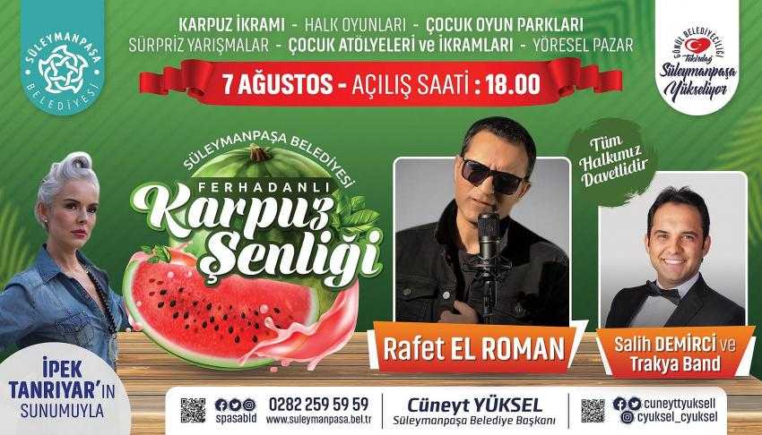 Süleymanpaşa Belediyesi Gençlik Hizmetleri ve Spor Müdürlüğü tarafından organize edilen 1. Ferhadanlı Karpuz Şenliği, çok sayıda etkinliğe ev sahipliği yapacak. Şenlik alanında günün erken saatlerinden itibaren yöresel ürünlerin görücüye çıkacağı yöresel pazarın yanı sıra karpuz ikramı yapılacak, çocuklar için çeşitli aktiviteler düzenlenecek. Ayrıca sürpriz yarışmalarla şenliğin eğlence katsayısı yükselecek.
