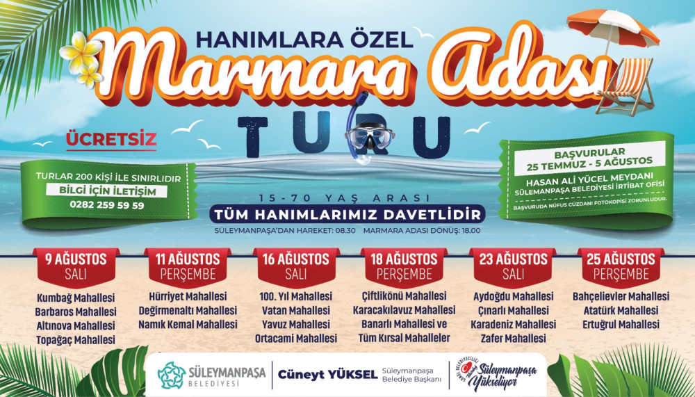 Süleymanpaşa Belediyesi Gençlik Hizmetleri ve Spor Müdürlüğü tarafından organize edilen ve 9-25 Ağustos tarihleri arasında düzenlenecek olan günübirlik Marmara Adası tatili için kayıtların başladığı, başvuruların 25 Temmuz - 5 Ağustos tarihleri arasında alınacağı ifade edildi. Konuyla ilgili 0 282 259 59 59 numaralı Süleymanpaşa Belediyesi Çağrı Merkezinden bilgi alınabileceği ve Hasan Âli Yücel Meydanı’nda (Tarihi Bedesten altı) bulunan Süleymanpaşa Belediyesi İrtibat Bürosundan kayıt yaptırılabileceği belirtildi. Başvuru sırasında isteklilerin yanlarında nüfus cüzdanlarını bulundurmasının zorunlu olduğu hatırlatıldı. Marmara Adası seyahati için feribot seferlerinin sabah 08.30 kalkış, akşam 18.00 dönüş olarak belirlendiği de aktarılan bilgiler arasında yer aldı. Turlarda kontenjanın 200 kişi ile sınırlı olacağı, katılmak isteyen hanımların rezervasyonlarını geciktirmeden yapmaları gerektiği hatırlatıldı.