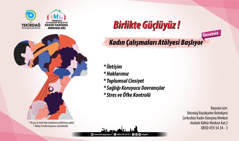Atölye çalışmalarına katılmak isteyen kadınlar, 9 Ocak 2023 Pazartesi günü mesai bitimine kadar Tekirdağ Büyükşehir Belediyesi Çerkezköy Kadın Danışma Merkezine giderek ya da 0 850 459 34 34 numaralı hattan dahili numara 3’ü tuşlayarak başvuru yapabilecek.