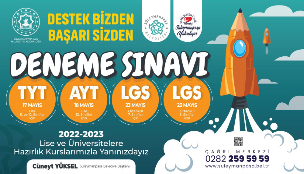 Süleymanpaşa Belediyesi tarafından Süleymanpaşa İlçe Milli Eğitim Müdürlüğü ile birlikte ortaokul ve lise öğrencilerine yönelik ücretsiz olarak gerçekleştirilen Temel Yeterlilik Testi (TYT), Alan Yeterlilik Testi (AYT) ve Liselere Geçiş Sistemi Testi deneme sınavları yapılmaya devam ediyor.