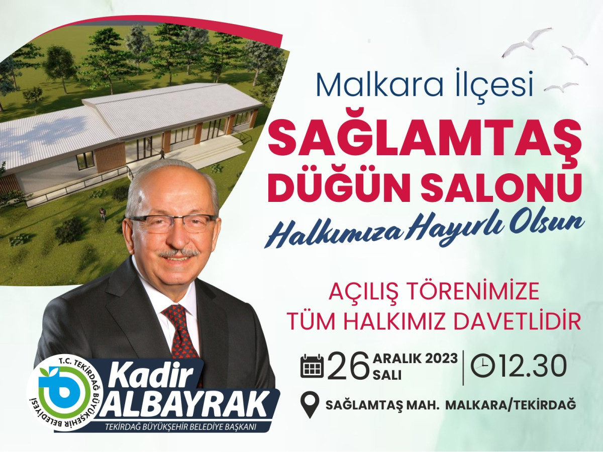 Cumhuriyet’in 100. Yılında Tekirdağ’da 100. yıla yakışır dev yatırımları vatandaşların hizmetine sunan, geniş hizmet yelpazesi ile toplumun her kesimine hitap eden projeleri hayata geçiren Tekirdağ Büyükşehir Belediyesi tarafından yapımı tamamlanan Malkara İlçesi Sağlamtaş Mahallesi Düğün Salonu 26 Aralık 2023 Salı Günü saat 12.30’da gerçekleştirilecek törenle hizmete açılacak.