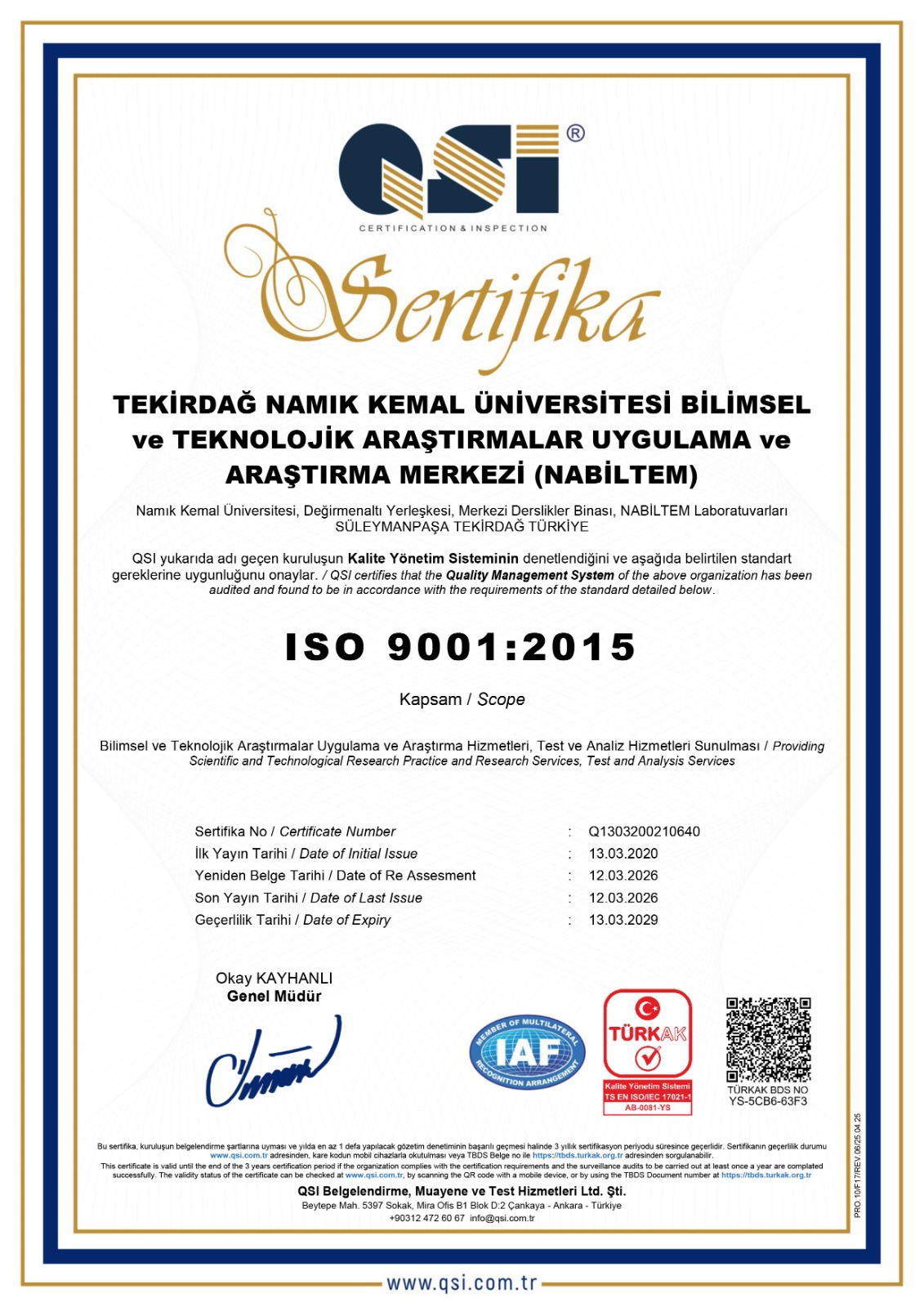 24.02.2026 tarihinde Türk Akreditasyon Kurumu (TÜRKAK) tarafından akredite bağımsız denetleyici kuruluş QSI Belgelendirme Baş Denetçisi Tanju ÇETİN tarafından yapılan denetim sonrası NABİLTEM, TS EN ISO 9001-2015 Toplam Kalite Yönetim Sistemi Sertifikasını tekrar almaya hak kazandı.