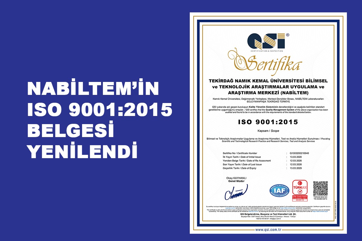 Tekirdağ Namık Kemal Üniversitesi Merkez Laboratuvarı NABİLTEM’in ISO 9001:2015 belgesi yenilendi.