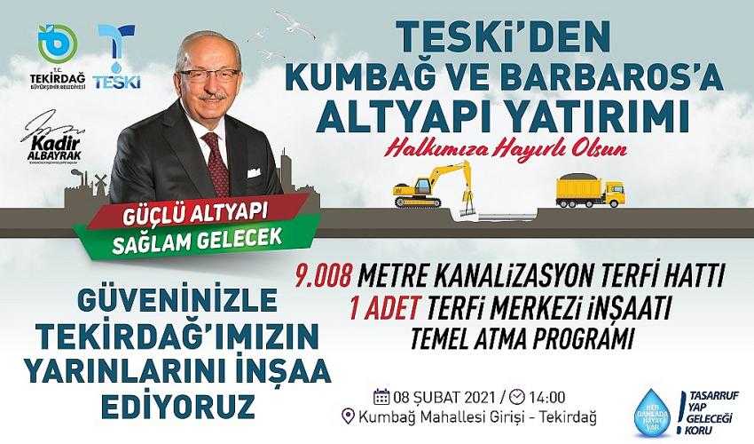 Tekirdağ genelindeki yatırımların hız kesmeden devam ettiğini dile getiren Tekirdağ Büyükşehir Belediye Başkanı Kadir Albayrak; "2015 yılında Barbaros Mahallesi ve 2016 yılında Kumbağ Mahallesi için ihalesi yapılarak yapımları tamamlanmış olan kanalizasyon hatları ile toplanan atık suların, mevzuata uygun şekilde arıtılabilmesini sağlamak adına Tekirdağ Batı İleri Biyolojik Atıksu Arıtma Tesisine iletilebilmesi için 9.008 Metre PE100 polietilen kanalizasyon terfi hattı ile 1 adet yeni atık su terfi merkezi imalatı ve 1 adet mevcut terfi merkezi revizyonu yapılacaktır." Dedi.